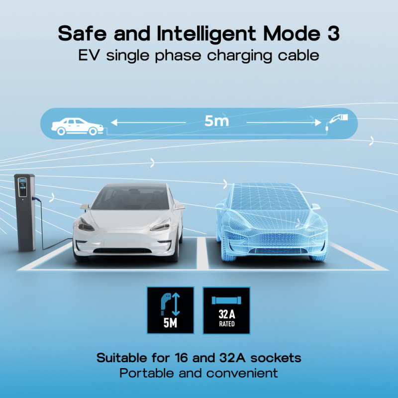 Type 2 to Type 2 Mode 3 EV Charging cable - 5 metre length, suitable for 16A and 32A single phase sockets