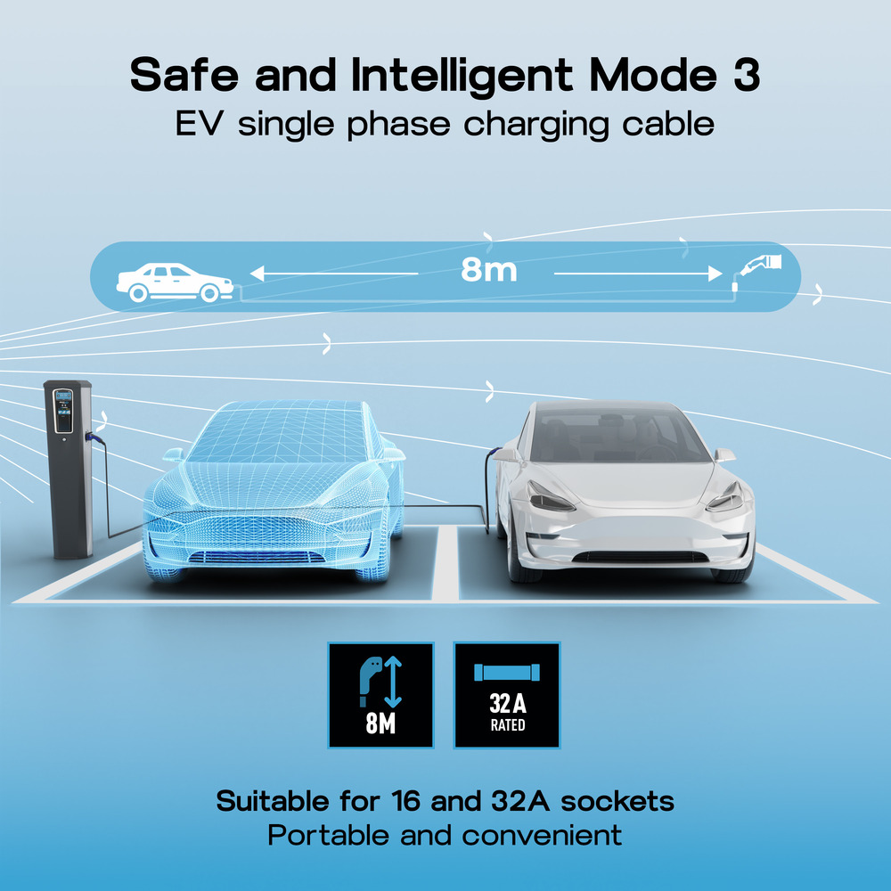 Type 2 to Type 2 Mode 3 EV Charging cable - 8 metre length, suitable for 16A and 32A single phase sockets